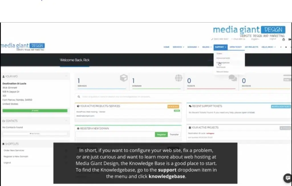 In short, if you want to configure your web site, fix a problem, or are just curious and want to learn more about web hosting at Media Giant Design, the Knowledge Base is a good place to start. To find the Knowledgebase, go to the support dropdown item in the menu and click knowledgebase.